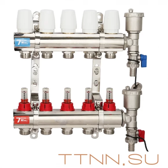 ViEiR Коллекторная группа из латуни 1" х 3/4" из латуни, с расходомерами 8 выходов (5/1) VR112-08A. Артикул VR112-08A. Коллекторная группа применяется для передачи жидкости на контуры отопления и настройки в них мощности потока и температуры в системе "теплый пол", а также подключения радиаторов отопления, других тепловых приборов. Основные рабочие элементы это "две гребенки," - коллекторы подающего и обратного контура.
